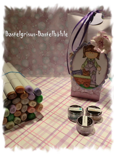 Stempelmagie und da ich eine kleine Box brauchte...habe ich mich mal an eine box in a Bag versucht...ich hoffe sie gefällt euch ein wenig... Sie ist in lila Tönen... Verwendet habe ich Papier das noch aus meinen Bastelanfängen ganz unten in meinem Papierregal lag... hier passte es endlich mal...